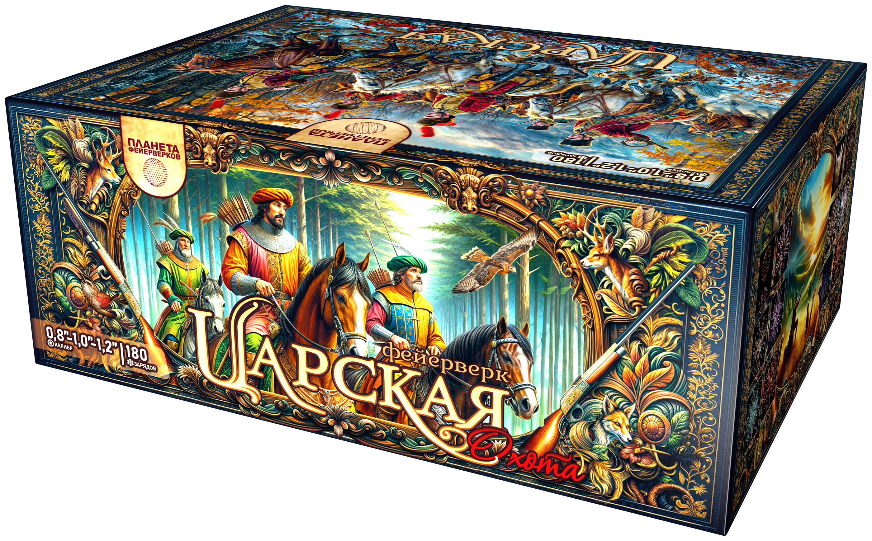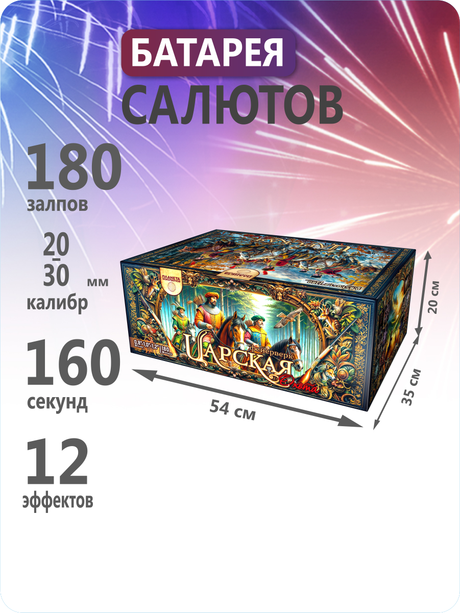 «Царская охота» — величественное огненное представление, достойное королей!180 зарядов калибром 0,8–1,0–1,2 дюйма взмывают на высоту до 30 метров, чтобы превратить ночное небо в арену фантастического зрелища. Словно сама природа отдаёт дань торжеству, фейерверк раскрывает перед зрителями череду чарующих образов. Пусть ваш праздник озарится сиянием «Царской охоты» — фейерверка, вобравшего в себя всю роскошь, мощь и красоту настоящего королевского торжества!