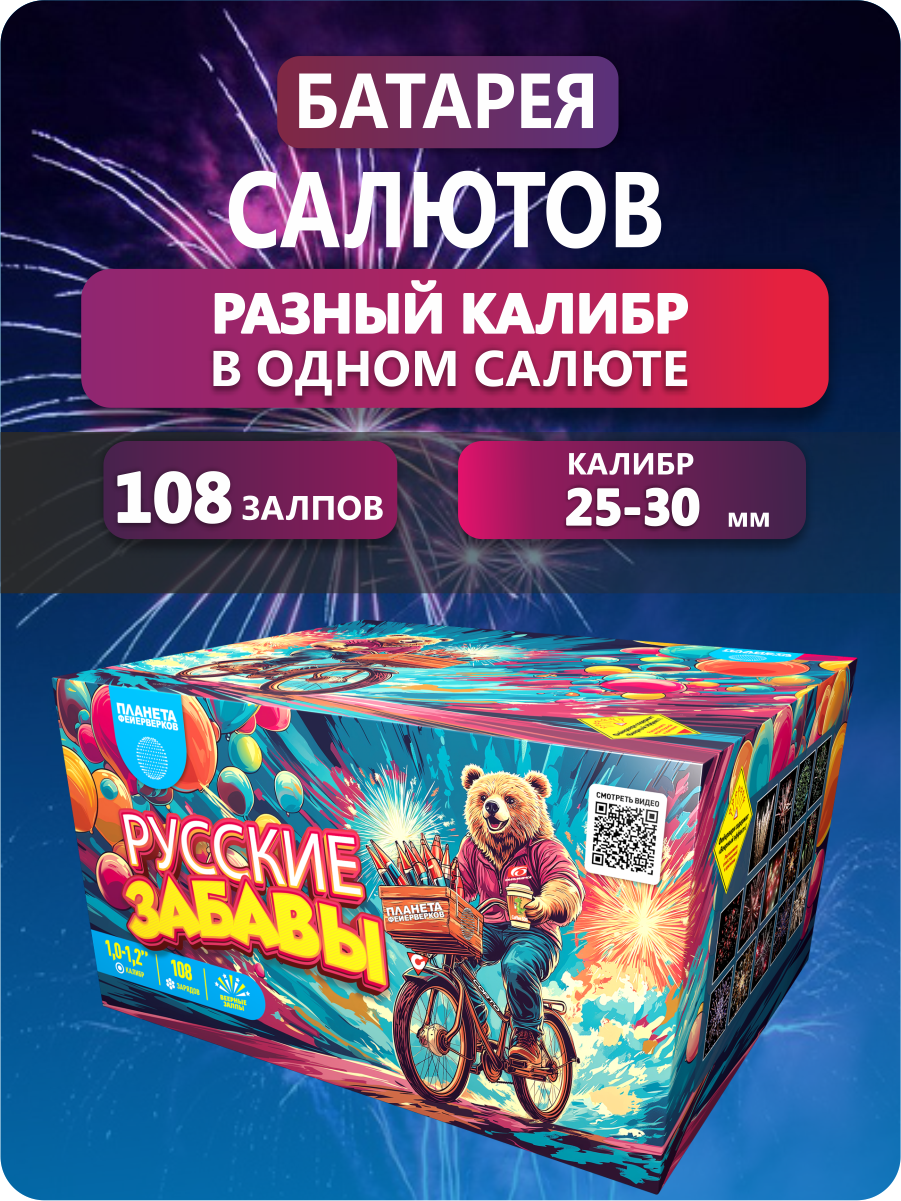 «Русские забавы» — огненная карусель радости, взмывающая в небо, чтобы подарить вам мгновения настоящего волшебства!108 залпов калибра от 1 до 1,2 дюйма взмывают на высоту до 30 метров, чтобы создать над вами настоящее праздничное действо. Словно народные гуляния в миниатюре, фейерверк раскрывает перед зрителями череду ярких образов. Пусть ваш праздник озарится сиянием «Русских забав» — фейерверка, вобравшего в себя дух народных гуляний и праздничного веселья!