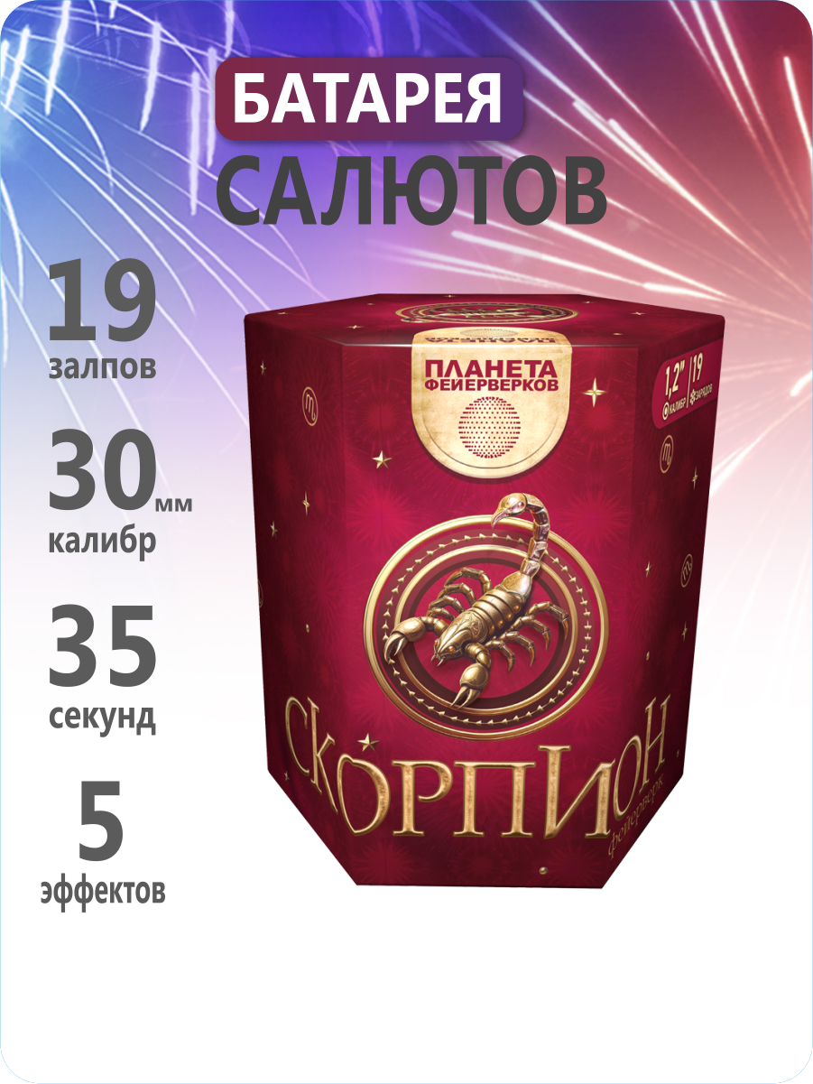 «Скорпион» — огненный танец созвездия, спустившегося с небес, чтобы озарить ваш праздник!19 зарядов калибром 1,1 дюйма взмывают на высоту до 25 метров, чтобы за 35 секунд создать над вами картину, полную динамики и волшебства. Словно ожившее созвездие, фейерверк раскрывает перед зрителями череду чарующих образов. Пусть ваш вечер озарится сиянием «Скорпиона» — фейерверка, полного энергии, ритма и незабываемых впечатлений!