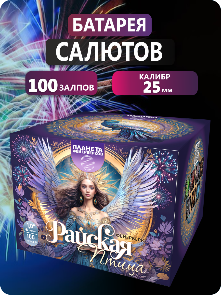 «Райская птица» — огненное чудо, воплотившее в себе всю красоту небесных звезд!100 зарядов калибра 1 дюйм взмывают на высоту до 25 метров, чтобы за 95 секунд подарить зрителям волшебное зрелище. Словно сказочная птица, расправившая огненные крылья, фейерверк рассыпает над землёй россыпь разноцветных чудес. «Райская птица» — фейерверк, который превратит небо в сказку!