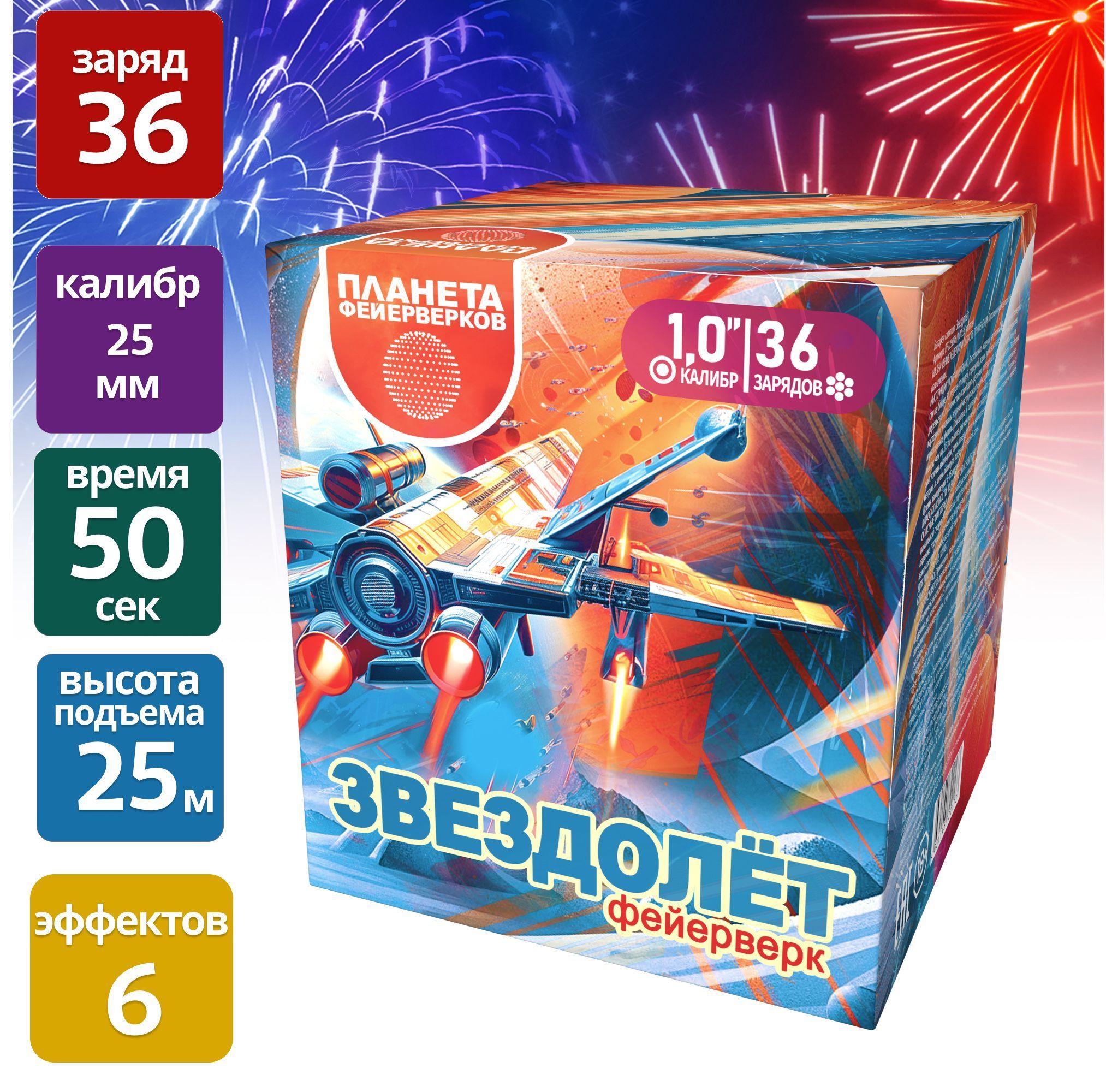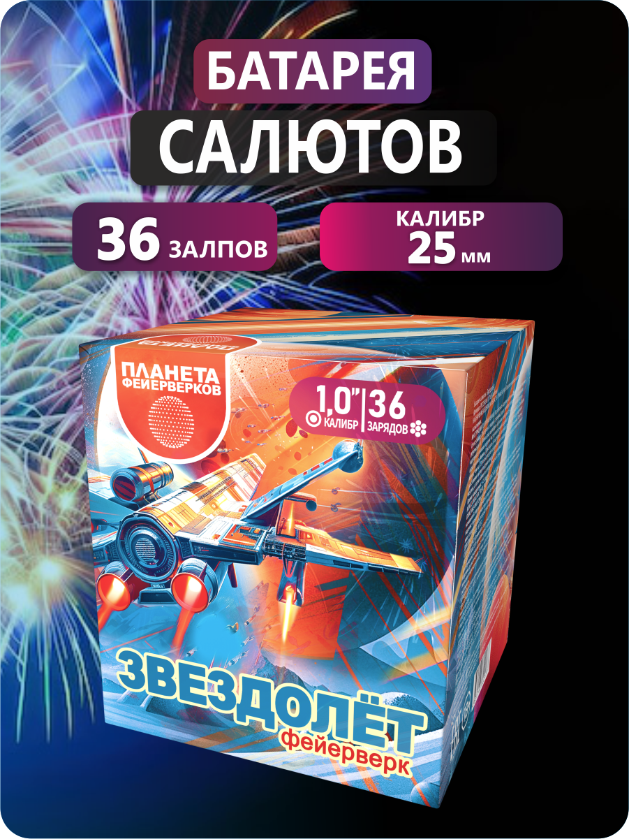 36 залпов калибра 1 дюйм взмывают в небо, словно корабли далёких галактик, и раскрываются на высоте до 25 метров в завораживающих узорах. 50 секунд волшебства — и вы уже не на земле, а среди звёзд. Пусть ваш праздник станет частью космической легенды с фейерверком «Звездолёт»!